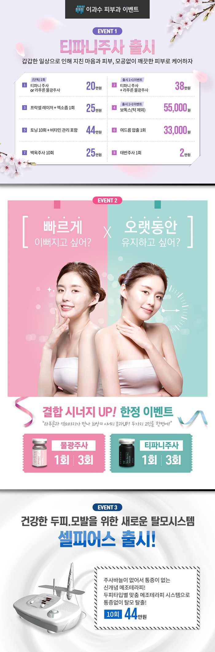이과수의원에서는 특히 요즘 주목받는 두피타입별 메조테라피, 셀피어스 탈모치료를 상의할 수도 있습니다. 가늘고 줄어든 머리숱이 고민인 분들, 통증없는 탈모관리를 원하는 분, 현재의 건강한 두피와 머릿결을 유지하고 싶은 분, 모발이식 전, 후 관리를 원하는 분들에게 상담을 추천할 수 있는 치료로 개인맞춤으로 치료가 진행되기에 남성형 탈모는 물론 여성형 탈모, 휴지기 탈모, 원형 탈모 등 다양한 탈모유형에 적용해 도움을 받게 될 수도 있다고 합니다.